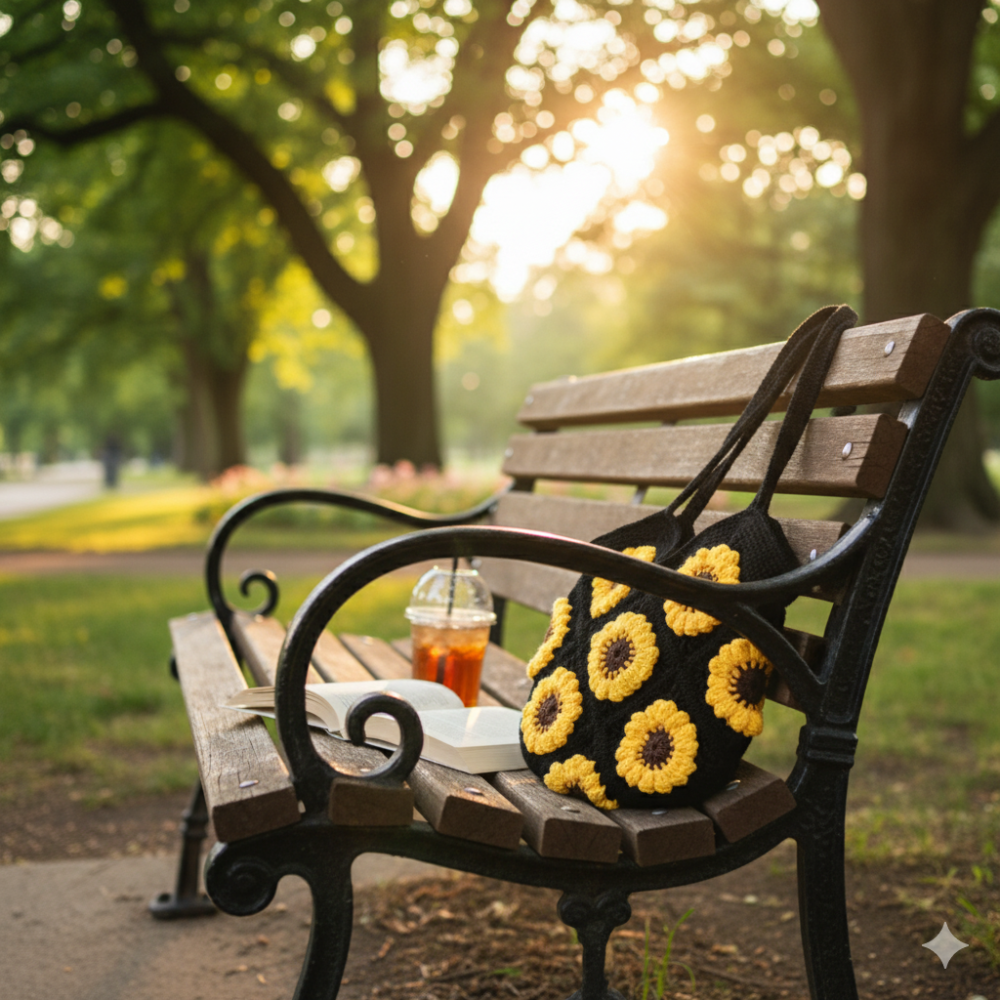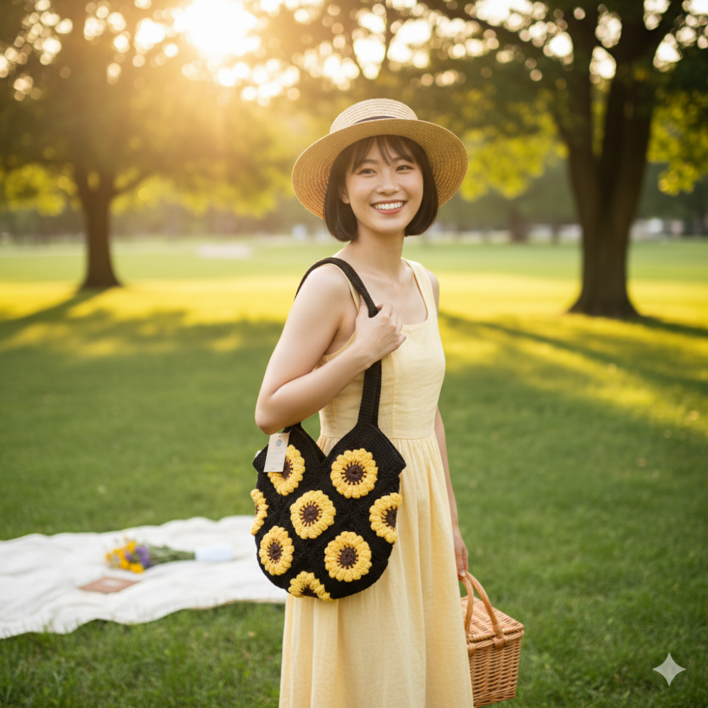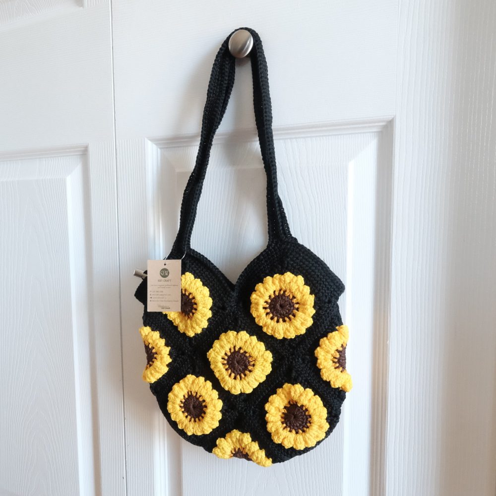 🧶 Handmade with Love — Crafted from soft, durable yarn with beautiful 3D sunflower motifs on a bold black background.